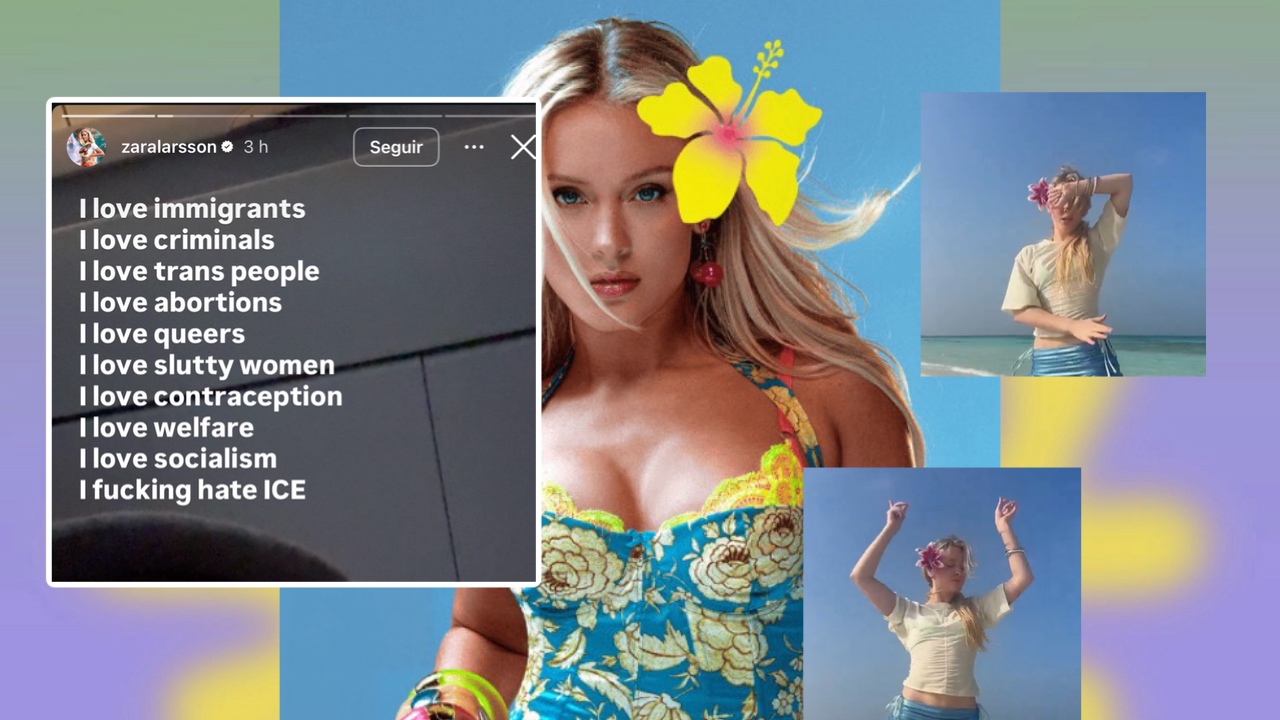 “Eu amo imigrantes Eu amo criminosos Eu amo pessoas trans Eu amo abortos Eu amo queers Eu amo mulheres vadias Eu amo contracepção Eu amo bem-estar social Eu amo socialismo Eu odeio pra c*** o ICE” Zara Larsson via Instagram Stories